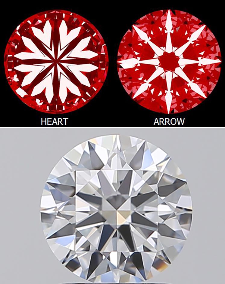 Das Herzen und Pfeile – Muster zeigt sich nur, wenn der Diamant von einem echten Meisterschleifer perfekt geschliffen wurde und dies ohne Rücksicht auf den dadurch höheren Materialverlust!
